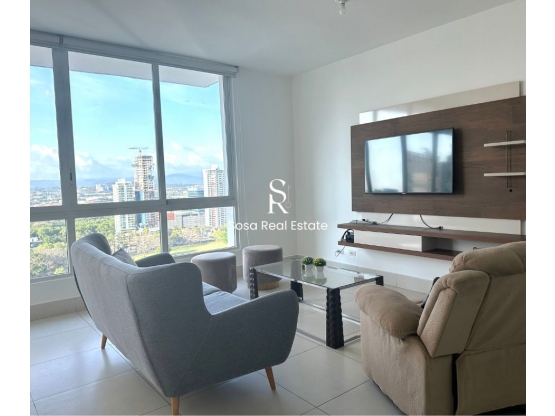 Con 113 m2, distribuídos en 2 recámaras, 2.5 baños, cocina abierta, sala comedor, 1 puesto de estacionamiento y excelentes vistas, este apartamento amoblado lo tiene todo.